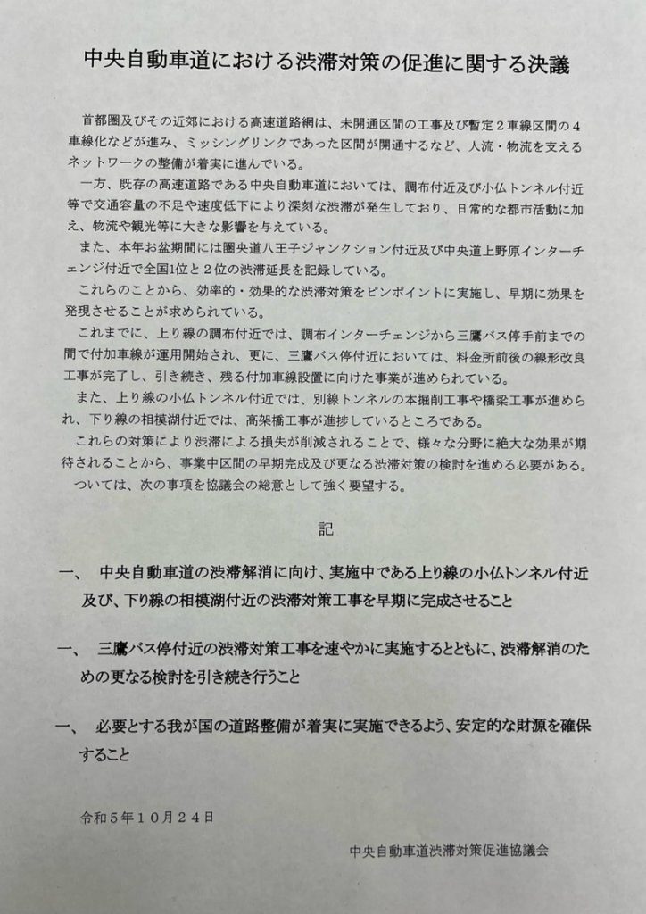 産業・経済面や観光の面からも、社会インフラとしての中央自動車道のさらなる利便性向上を求めたいと思います。